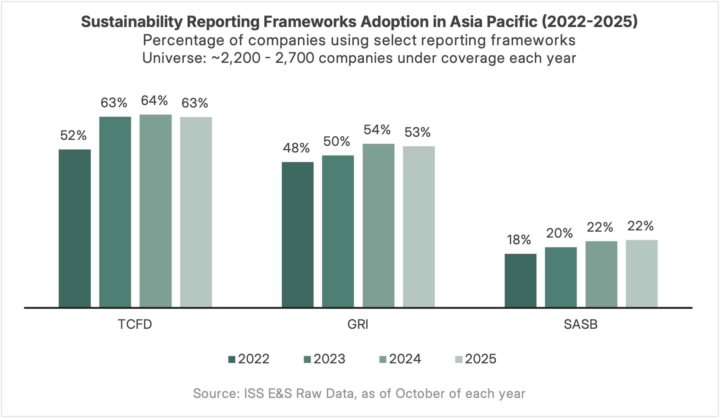 GRI remained steady, reaching 54% in 2024 before dipping slightly to 53% in 2025. Its persistence reflects continued demand for broad sustainability disclosures, even as climate-specific mandates take center stage. Companies in markets like Taiwan and South Korea, where GRI adoption is particularly high, often use it to complement climate-focused frameworks and meet broader stakeholder expectations.
