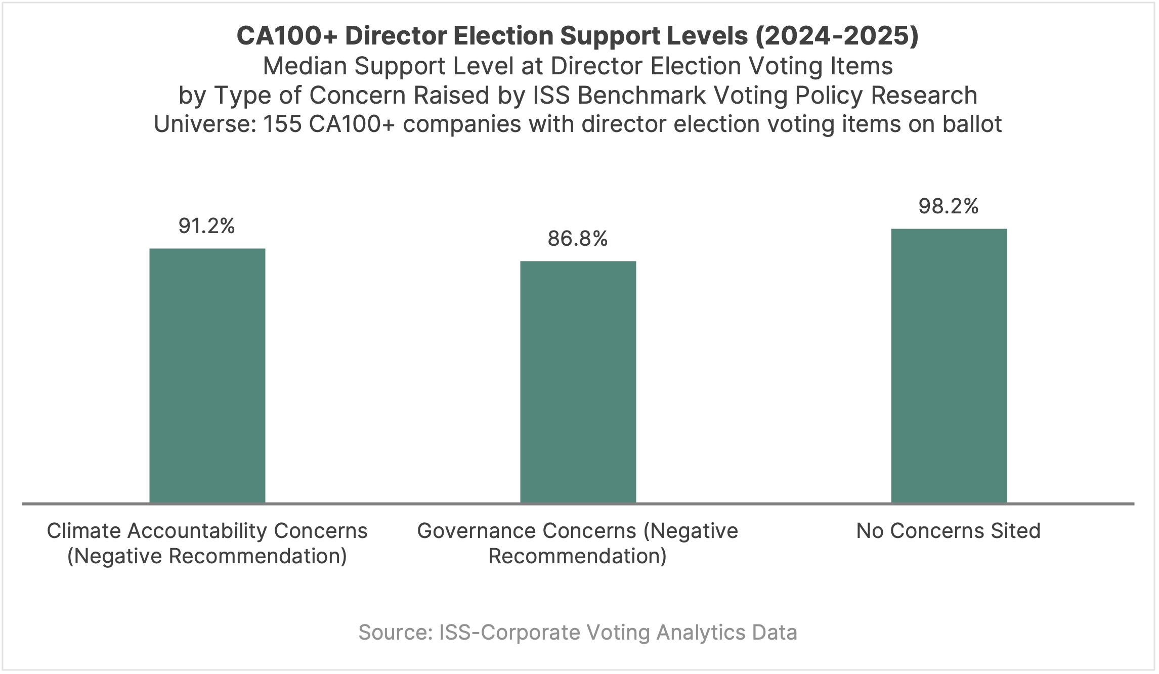 A review of ISS Benchmark Policy recommendations over the past two years shows that while governance concerns remain the primary driver of negative recommendations among Climate Action 100+ companies, climate-related issues also contribute to voting risk for a smaller subset of the universe. Director elections appeared on ballots at 155 companies, and climate concerns under ISS’s Climate Board Accountability policy were raised at nine of them. Although this is a relatively limited portion of the list, flagged items consistently attracted lower support, with median backing of about 91% of votes cast FOR and AGAINST compared with roughly 98% where no concerns were raised. Governance-related issues – including board independence, director over-boarding, and other structural issues – were more widespread, affecting 42 companies and generating even lower median support of around 87% when negative recommendations were issued.