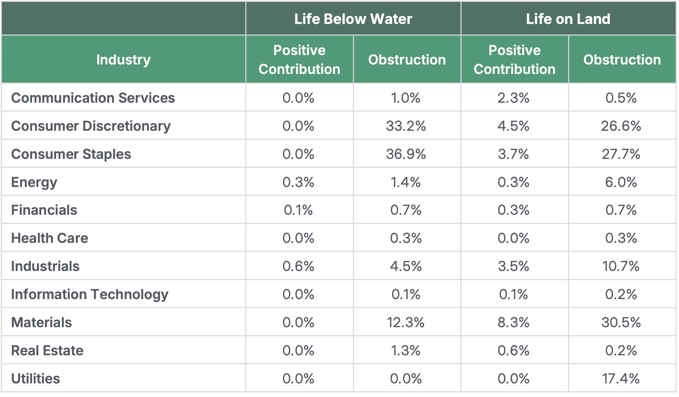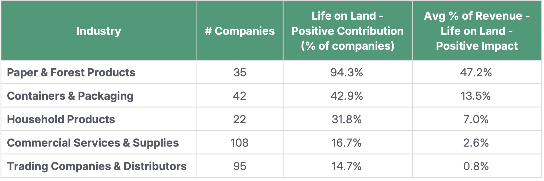 Positive contribution signals for Life on Land are more concentrated and, in a few industries, more material. The Paper & Forest Products industry shows the strongest solution profile (94% of companies; 47% average revenue exposure), centered on products from relevant certified sustainable forestry. Containers & Packaging (43% of companies; 14%) and Household Products (32%; 7%) also register meaningful positive contribution shares through certified forestry inputs, even as those same value chains can appear on the obstruction side when associated with single-use plastics – illustrating how impact signals diverge based on material inputs and use. Commercial Services & Supplies adds a distinct solutions set (17%; 3%) including soil remediation services, terrestrial ecosystem restoration, and terrestrial oil-spill containment services, highlighting that SDG 15 “solutions” often sit in specialized restoration and mitigation capabilities rather than mainstream consumer product categories.