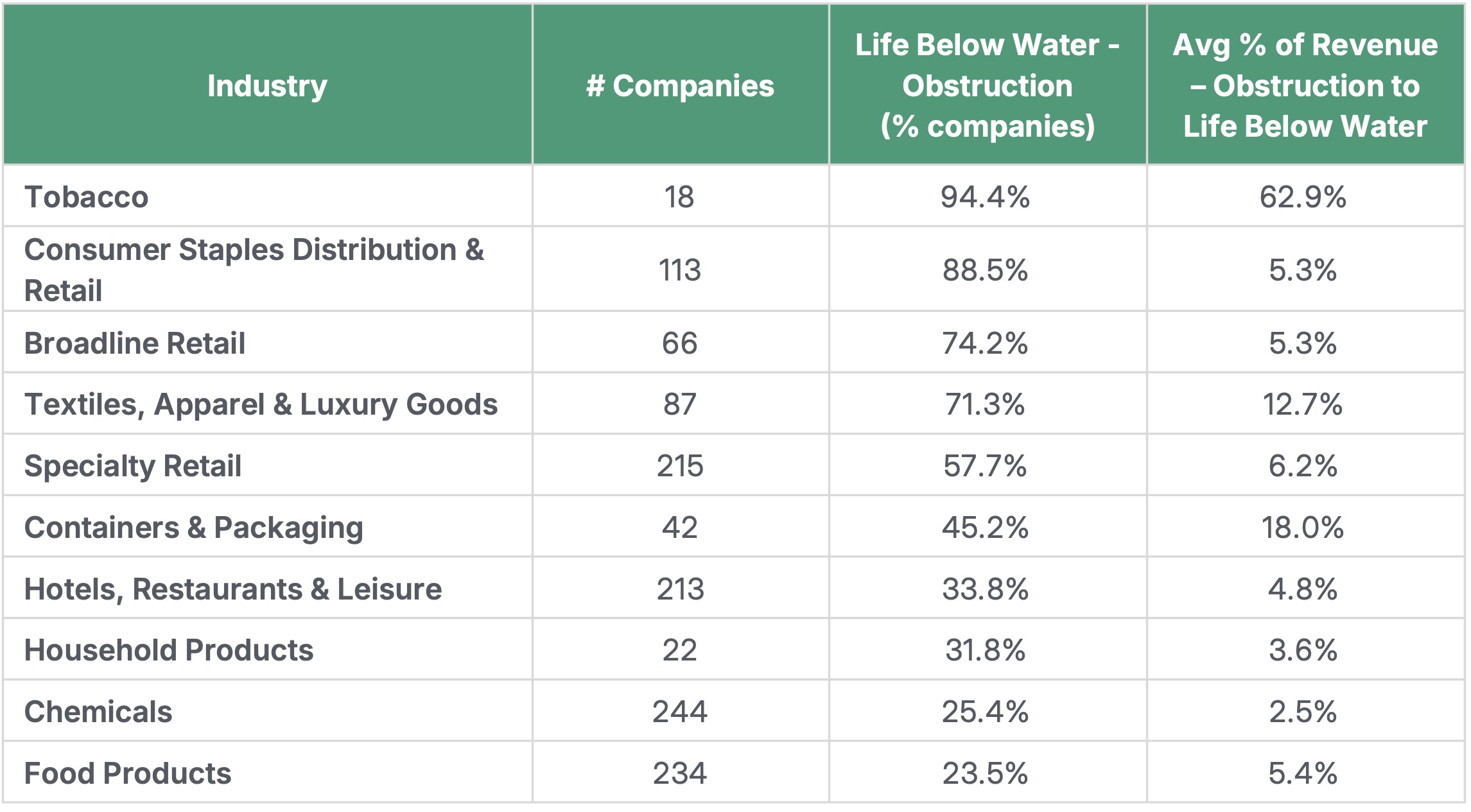 Across the industries with the highest exposure to marine-life obstruction, the data suggests that product-linked risks are concentrated in consumer-facing value chains and materials-intensive business models. Tobacco stands out, with 94% of companies in the industry associated with obstructive product impacts and an average 63% of revenue linked to those products – driven by categories such as electronic cigarettes and filtered nicotine products, as well as filter components that can contribute to persistent waste. Consumer Staples Distribution & Retail (89% of companies) and Broadline Retail (74%) also show high prevalence, reflecting product mixes that include fish and seafood offerings without relevant certification, single-use plastic products, and products containing microplastics. These patterns reinforce that SDG 14 exposure is often embedded in everyday products and sourcing choices rather than limited to a narrow set of “marine” industries.