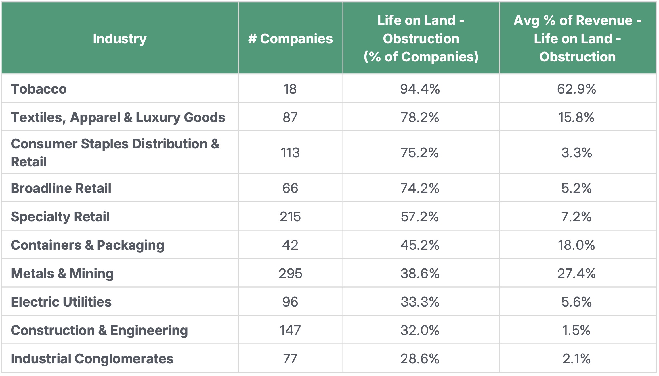Across industries with the highest exposure to Life on Land obstruction, the product mapping suggests that negative impacts are more prevalent than positive contributions and here too sit in consumer-facing categories with complex supply chains. Tobacco again stands out (94% of companies; 63% average revenue exposure), driven by product categories such as electronic cigarettes and filtered nicotine products. Several retail-linked industries also show elevated prevalence – Textiles, Apparel & Luxury Goods (78%), Consumer Staples Distribution & Retail (75%), Broadline Retail (74%), and Specialty Retail (57%) – reflecting product mixes that include synthetic polymer-fiber textiles, products containing microplastics, and single-use plastic products, along with select extractives-linked goods such as primary gold and natural diamond-based products. The overlap with SDG 14 is notable across many of these same industries, reinforcing that product portfolios associated with plastic leakage and microplastic pathways raise both terrestrial and marine ecosystem concerns.