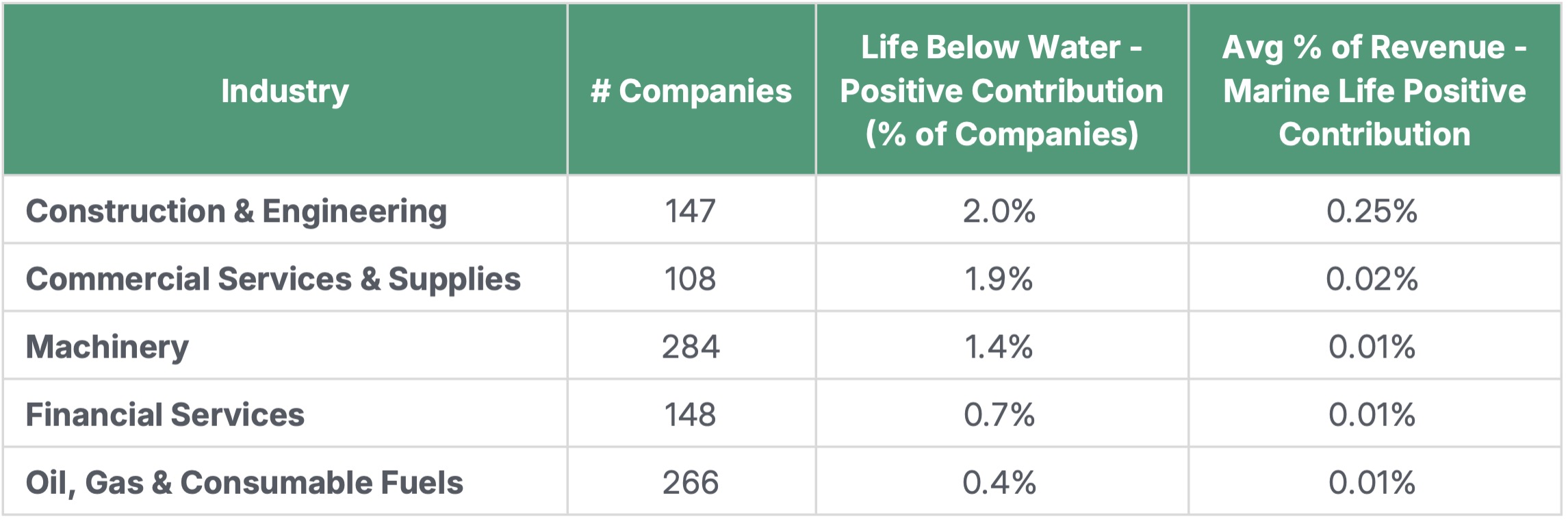 Positive contribution exposure is comparatively limited, but the data surfaces a small set of enabling products and services. Construction & Engineering (2% of companies) and Commercial Services & Supplies (1.9%) include offerings such as marine ecosystem restoration and conservation and marine oil-spill containment services. Machinery (1.4%) features ballast water management systems, which can support efforts to reduce ecological disruption associated with shipping. The Financial Services (0.7%) industry appears through financing that supports marine ecosystem restoration. Taken together, these categories suggest that SDG 14 “solutions” are more likely to sit in specialized capabilities – restoration, prevention, and mitigation – rather than in broad-based consumer product lines, reinforcing the importance of targeted innovation and capital allocation.