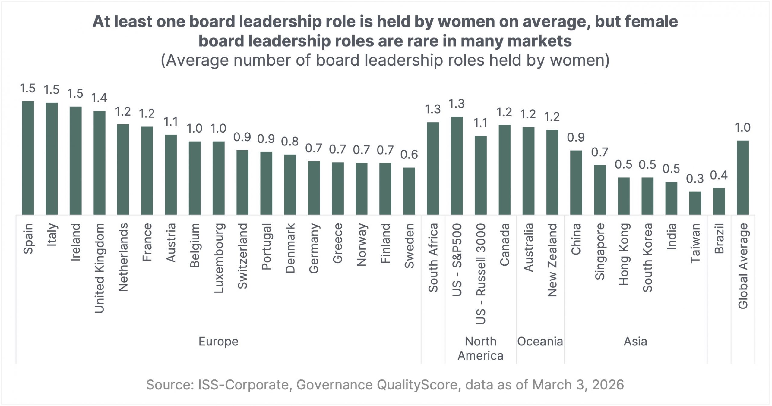 While women today hold nearly 30% of board seats globally, those holding leadership roles within the board are rare. Only one board leadership role—defined as the board chair, lead director, or the chair of any of the audit, compensation, or nominating committees—is occupied by women globally on average.