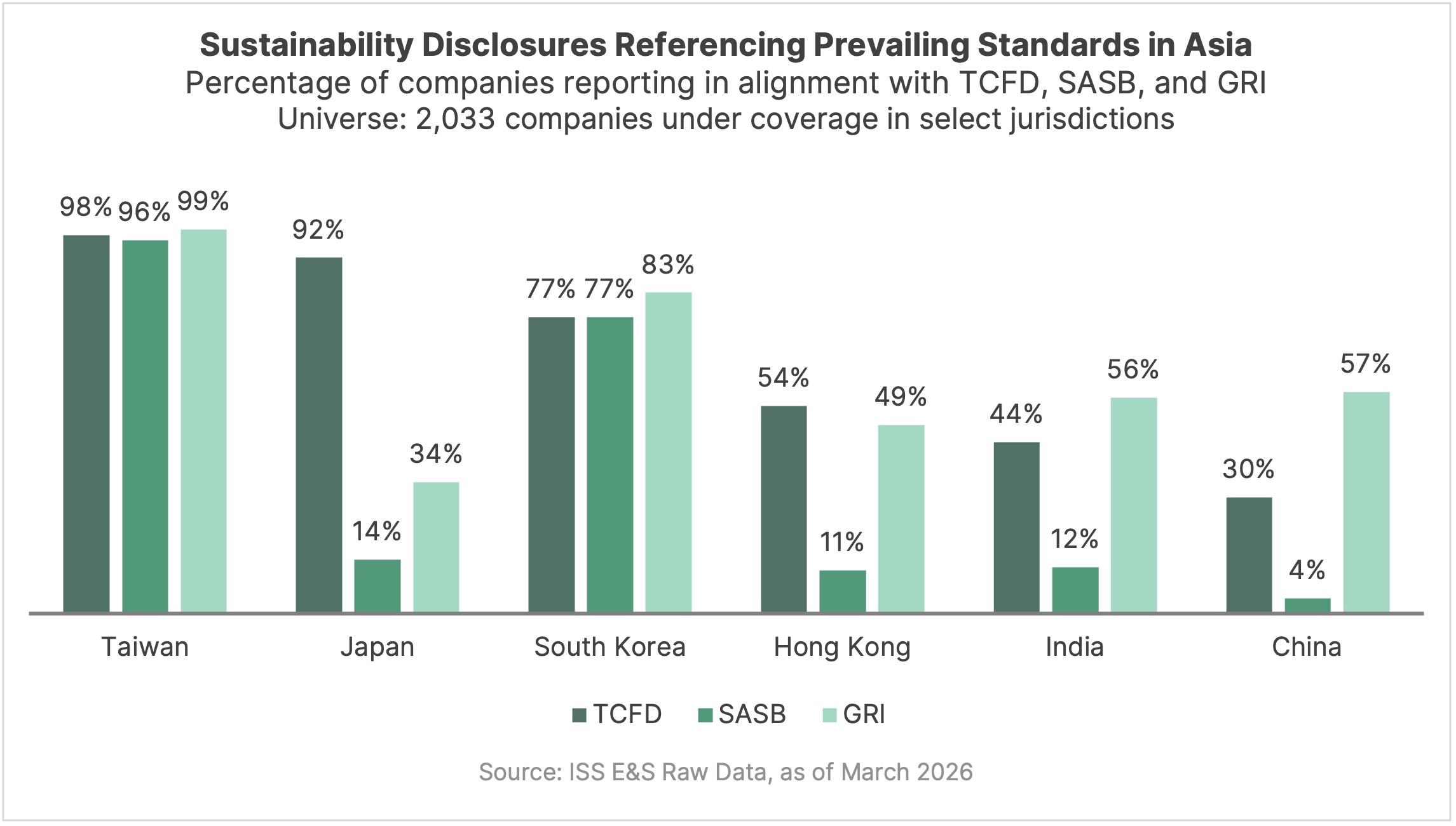 Taiwan stands out as one of the most mature sustainability reporting markets in Asia. Corporate disclosure data show near‑universal referencing across TCFD, SASB, and GRI, reflecting a well‑established, multi‑framework reporting environment. These disclosure patterns are underpinned by a long‑standing regulatory backdrop: prior to the Financial Supervisory Commission of Taiwan’s announcement in October 2025 to adopt the IFRS Sustainability Disclosure Standards, listed companies had been required to report in accordance with the GRI Standards. This historical reliance on GRI, alongside strong climate‑focused and industry‑based disclosure practices, provides important context as Taiwan moves toward closer alignment with IFRS‑aligned sustainability reporting requirements and implementation remains underway.